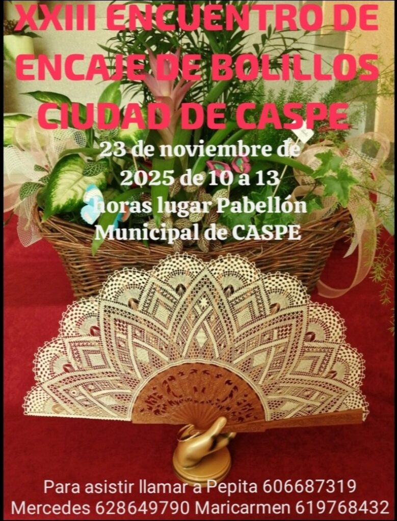 A orillas del Ebro, donde la historia medieval resuena en cada piedra, Caspe se convierte este noviembre en punto de encuentro para quienes entienden que el arte también se trenza con hilo, alfileres y paciencia. El XXIII Encuentro de Encaje de Bolillos Ciudad de Caspe convoca a aficionadas, artesanas y curiosas el próximo 23 de noviembre de 2025, de 10:00 a 13:00 h, en el Pabellón Municipal de la ciudad. Una cita breve, pero intensa, que cada año reúne saberes, puntillas y sonrisas compartidas.